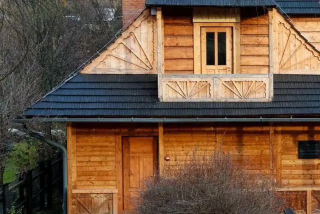 הגג החד והמוארך שאופייני לאזור מונע הצטברות שלג, אך גם מעניק למבנה מראה מרשים בעל אופי כפרי מדויק. עבודות הגילוף המעטרות את מעקות המרפסות ואת המסגרות של החלונות מציגות רמה גבוהה של אומנות ידנית שהלכה ונעלמה מהעולם. המוטיבים חוזרים בצורה מחזורית ויוצרים תחושת הרמוניה, כאילו הבית כולו הוא יצירה אחת גדולה.